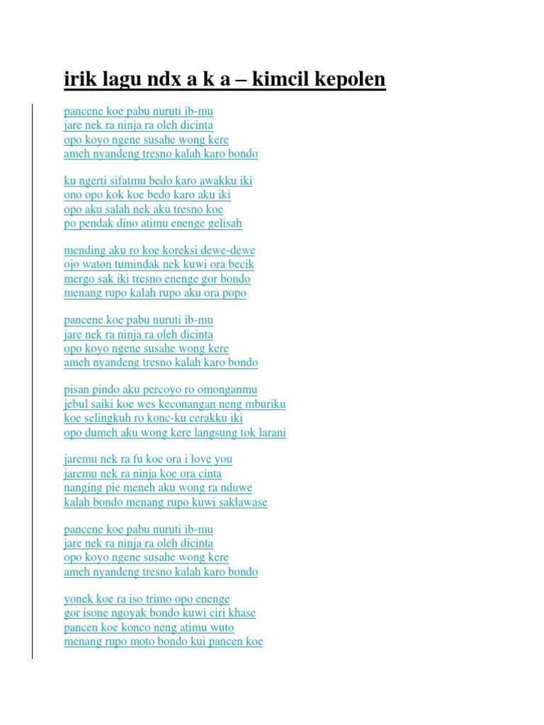 Pancene koe pabu nuruti ib-mu Jare nek ra ninja ra oleh dicinta Opo koyo ngene susahe wong kere Ameh nyandeng tresno. NDX AKA dikenal sebagai band asal Yogyakarta yang punya gaya khas dalam menyanyikan lagu-lagu mereka. Lirik lagu Kimcil Kepolen.